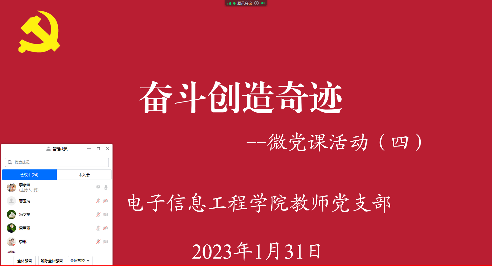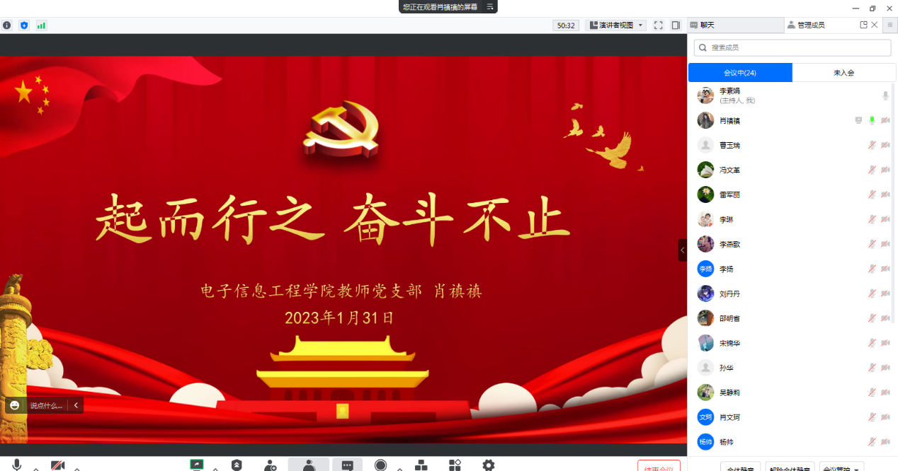 为了深入学习宣传贯彻党的二十大精神,2023年1月31日上午,电子信息工程公司教师党支部召开了以“奋斗创造奇迹”为主题的线上微党课交流活动,会议由支部书记李素娟主持,全体党员参加。