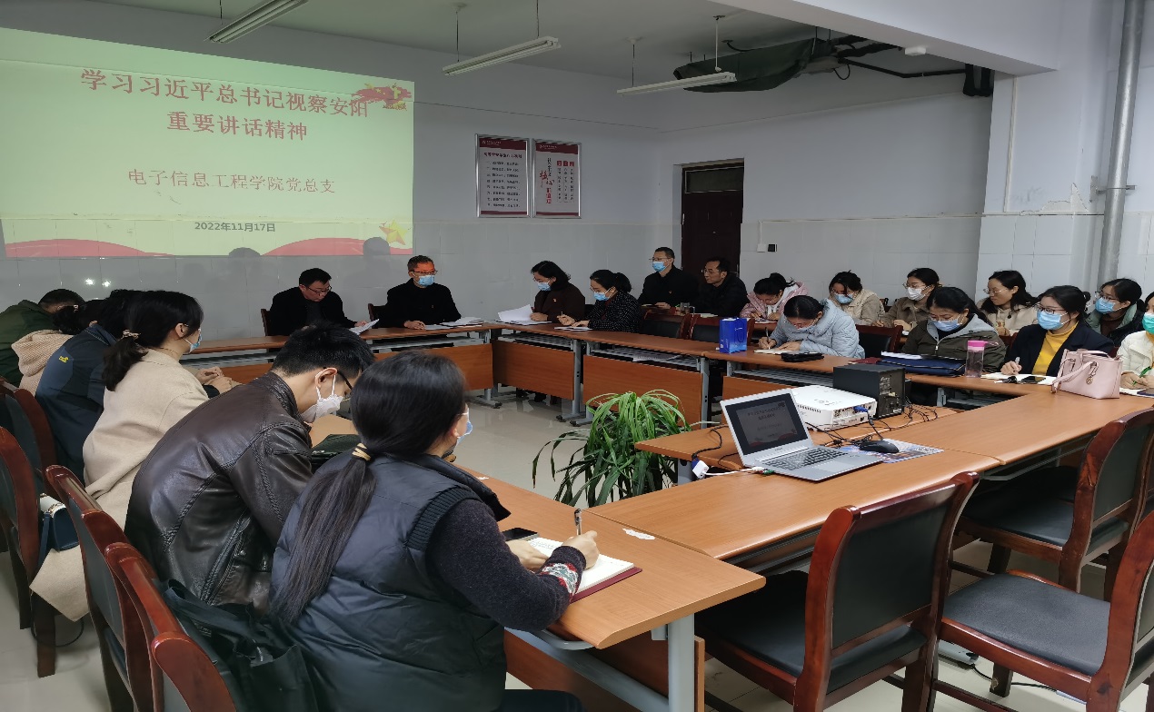 11月17日,电子信息工程yl9193永利党总支在拓新2号楼1331会议室召开全体党员大会,传达学习习近平总书记在安阳考察时的重要讲话精神,会议由党总支书记奚建刚主持。