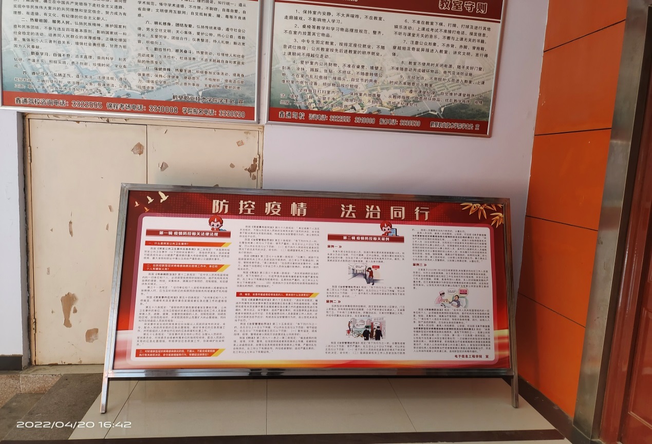 2022年4月24日—27日电子信息工程公司17个班级分别在本班早晚自习教室召开了法治教育宣传周主题班会。为了进一步加强宣传,营造氛围,制作了有关消防安全知识和疫情相关工作的宣传版面,及时宣传报道抗疫过程中涌现出的典型事迹。