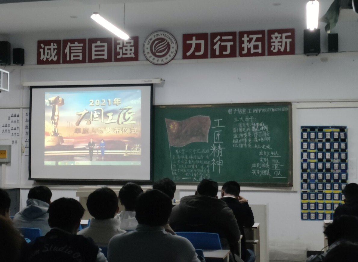 全体同学集中观看了《2021年“大国工匠年度人物”发布仪式》,认真学习了艾爱国等十位大国工匠年度人物多年扎根一线工作岗位的光辉事迹。活动中,同学们被大国工匠们的超高技艺、精湛技术、敬业精神、高尚品德和辉煌成绩深深震撼。