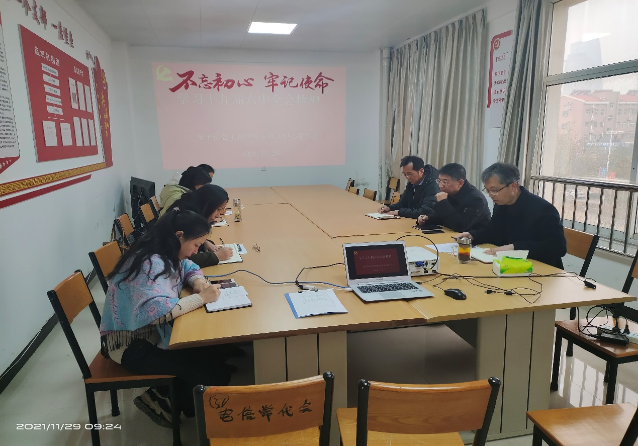 11月29日下午,电子信息工程yl9193永利党总支召开中心组(扩大)学习会,专题学习党的十九届六中全会精神。会议由党总支副书记曹玉瑞主持,党总支委员和教师党支部、员工党支部委员参加。