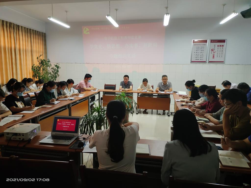 2021年9月2日下午,电子信息工程公司教师党支部于樱花园拓新2号楼3楼1331会议室召开党史学习教育专题组织生活会,会议由支部副书记李素娟主持,党总支书记奚建刚以普通党员身份与支部全体党员教师一起参加会议。