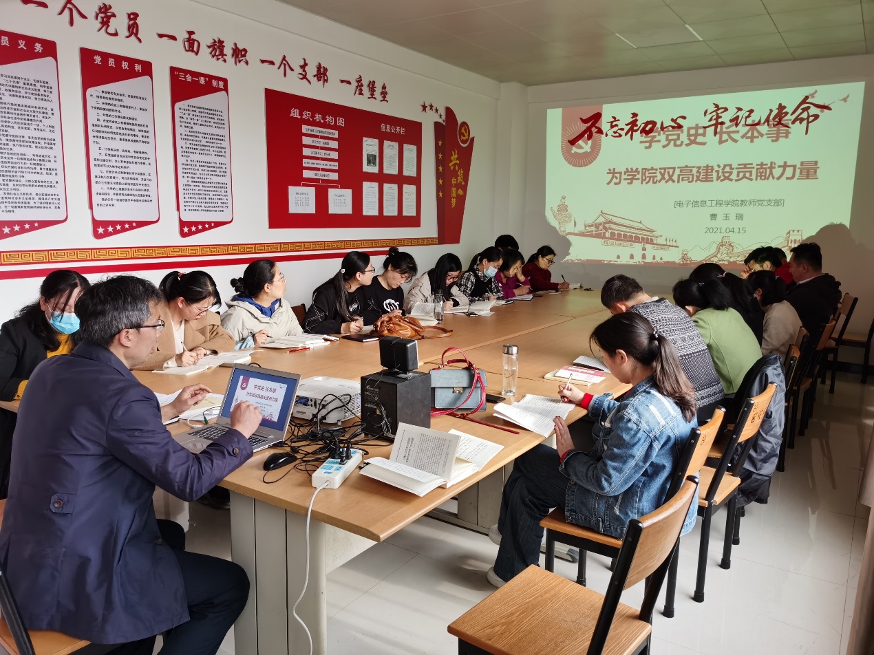 4月15日下午,电子信息工程yl9193永利党总支副书记曹玉瑞在拓新楼1325会议室,以“学党史 长本事 为公司双高建设贡献力量”为主题为教师党支部全体党员讲授党课。