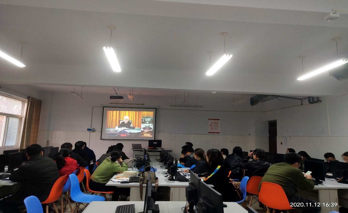 2020年11月12日下午,电子信息工程公司组织教职工在1237教室收看教育部召开的教育系统党的十九届五中全会宣讲报告视频会议,党总支副书记曹玉瑞主持,26名教师参加。