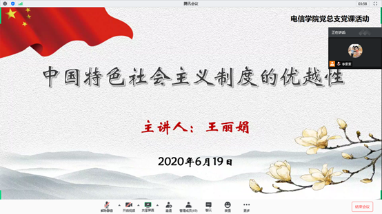 2020年6月19日下午,电子信息工程yl9193永利党总支通过腾讯会议召开全体党员大会,邀请马克思主义公司的王丽娟老师讲授专题党课——《中国特色社会主义制度的优越性》,党总支79名党员、预备党员和积极分子参加了本次党课。