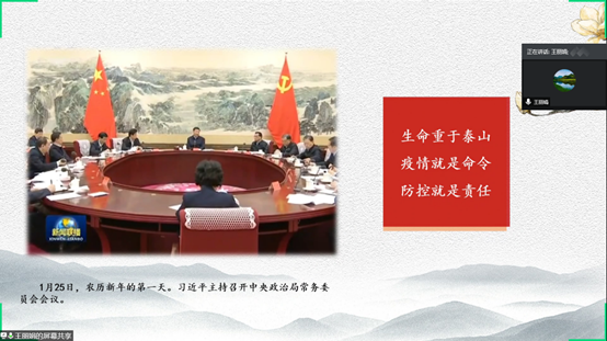 王丽娟老师结合疫情防控,从四个方面诠释了中国特色社会主义制度的优越性。王老师分析指出:我国优越的制度源自于中国共产党的初心与使命、源自于社会主义本质规定和价值取向、源自于我国始终坚持把马克思主义理论和国家实际相结合。