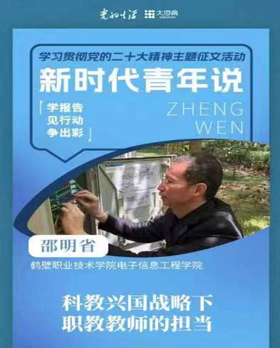 近日,电子信息工程公司邵明省老师积极参与了《党的生活》杂志与大河网举办的新时代青年说征文活动,《科教兴国战略下职教教师的担当》一文被大河网刊发。文章以党的二十大报告强调的科教兴国为主线,从打铁还需自身硬、育人育德育心等方面强调了科技、教育与人才的重要性,将党的二十大精神作为思政元素融入课程,加强员工思想道德教育,用责任感、使命感厚植员工的拼搏精神,用专业励志案例鼓励员工,提升动手能力,为人才储备提供支撑。