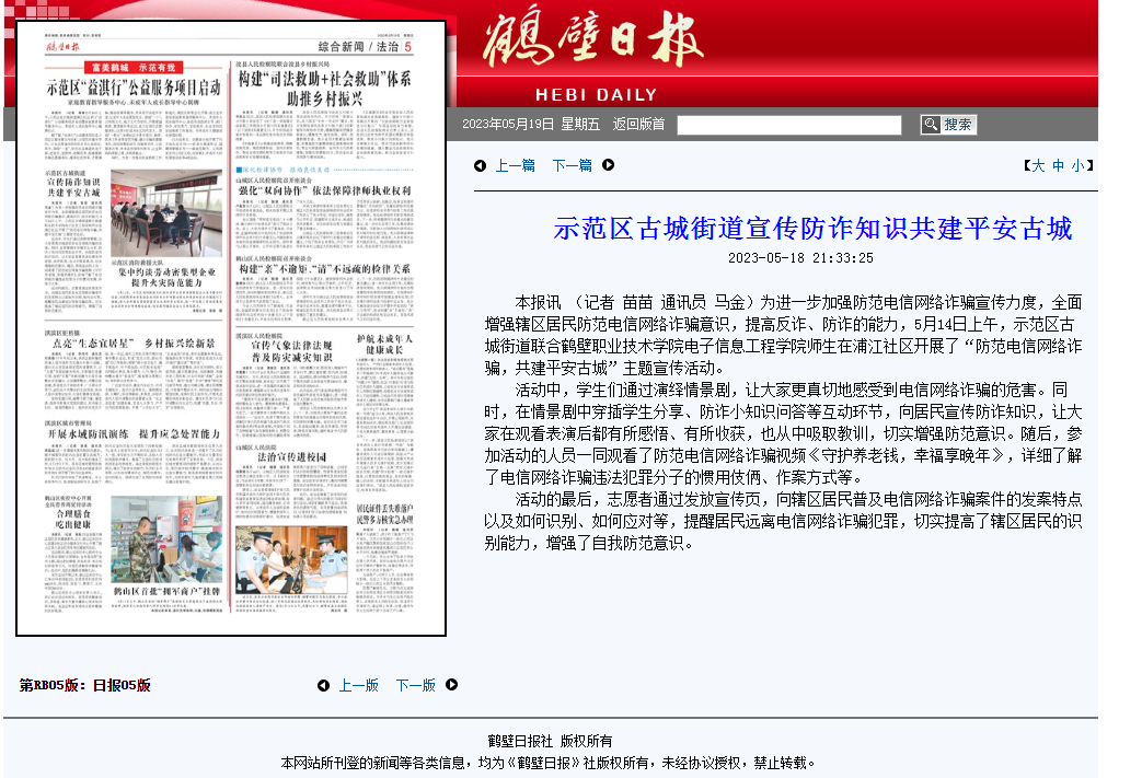 近日,电子信息工程公司师生联合浦江社区党支部开展的“5.17电信日”反电信诈骗主题党日活动,被鹤壁电视台、《鹤壁日报》等媒体宣传报道,5月22日通过鹤壁学习平台推送至学习强国。